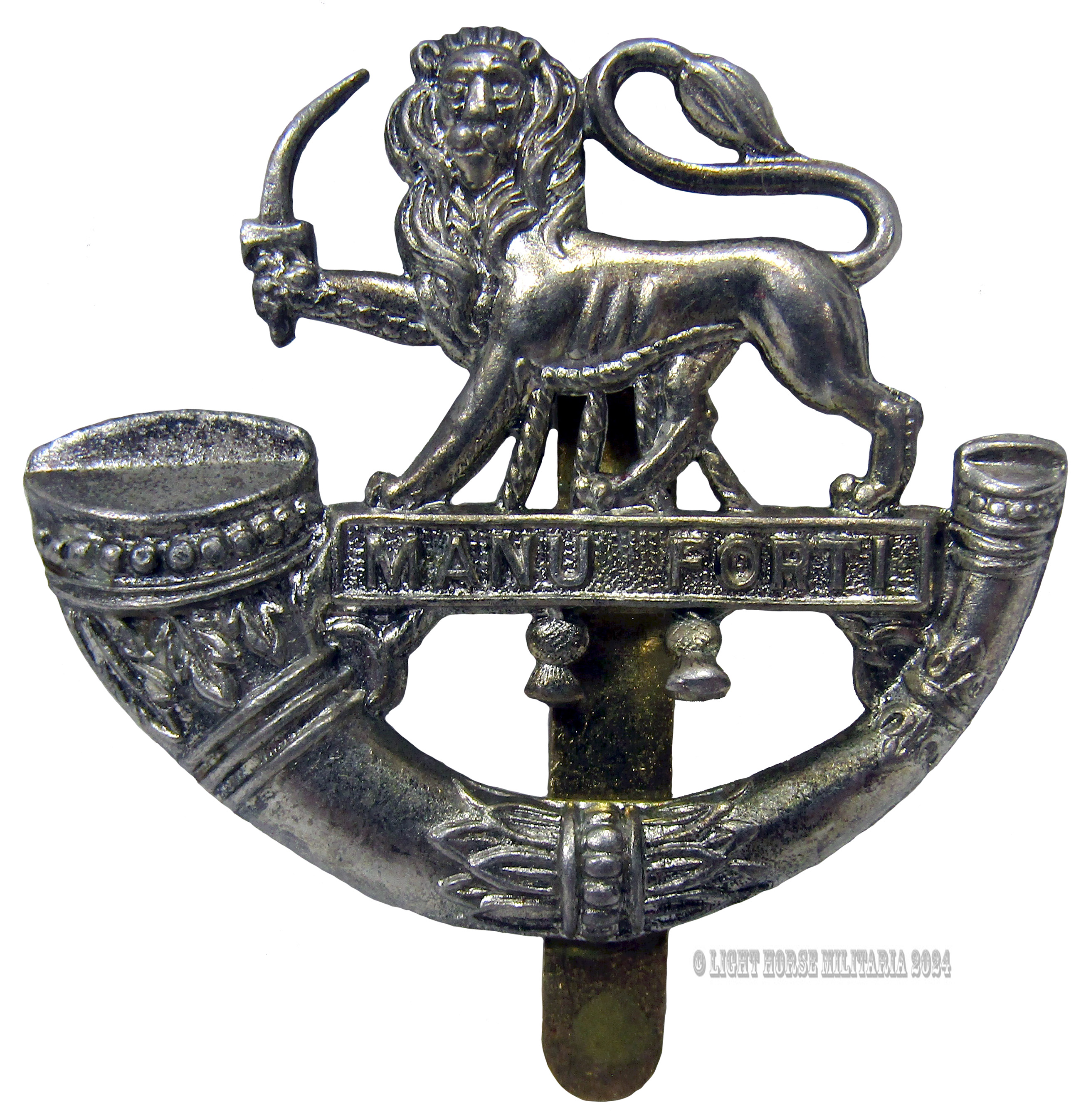 Post-WWII Britain MANU FORTI Herefordshire Infantry Cap Badge